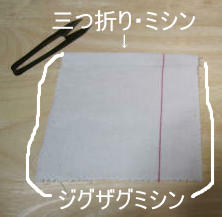 上を、5mm折ってさらに2cmの三つ折りにし、ミシンをかける。